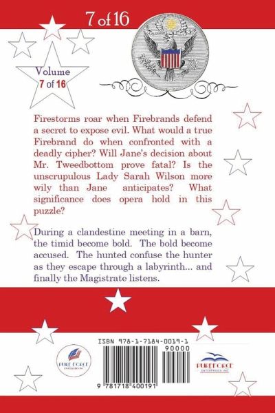 Firestorms roar when Firebrands defend a secret to expose evil. What would a true Firebrand do when confronted with a deadly cipher? Will Jane’s decision about Mr. Tweedbottom prove fatal? Is the unscrupulous Lady Sarah Wilson more wily than Jane anticipates? What significance does opera hold in this puzzle? During a clandestine meeting in a barn, the timid become bold. The bold become accused. The hunted confuse the hunter as they escape through a labyrinth... and finally the Magistrate listens.