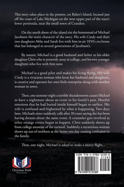 This story takes place in the present, on Baker's Island, located just off the coast of Lake Michigan on the west upper part of the state’s lower peninsula, near the small town of Crandon. On the north shore of the island sits the homestead of Michael Jacobson the main character of the story. His wife Cindy and their two daughters Abby and Sarah live with him in an 1850’s era home that has belonged to several generations of Jacobson’s. By nature, Michael is a good husband and father to his older daughter Chris who is presently away at college, and his two younger daughters who live with him now. Michael is a good pilot and makes his living flying. His wife Cindy is a vivacious woman who loves her husband and daughters, is creative and operates her own little enterprise along with another woman in town. Then, one summer night a terrible thunderstorm causes Michael to have a nightmare about an event in his family’s past. Hurtful emotions that he had buried inside himself began to surface. His wife is confused and frightened by what is happening. Two days later, Michaels sister suddenly calls after 20 years saying she has been having dreams about the same event. A counselor gets involved as other strange events began to happen. Chris suddenly shows up from college unaware of the turmoil. Suddenly a mysterious woman shows up out of nowhere at the home one day causing confusion in the family. Then, one night, Michael is asked to make a mercy flight…