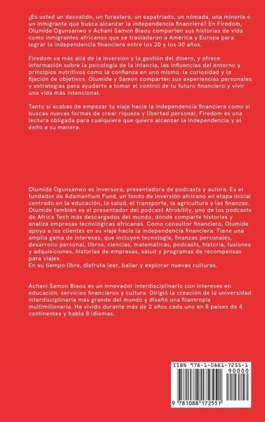 ¿Es usted un desvalido, un forastero, un expatriado, un nómada, una minoría o un inmigrante que busca alcanzar la independencia financiera? En Firedom, Olumide Ogunsanwo y Achani Samon Biaou comparten sus historias de vida como inmigrantes africanos que se trasladaron a América y Europa para lograr la independencia financiera entre los 20 y los 30 años. Firedom va más allá de la inversión y la gestión del dinero, y ofrece información sobre la psicología de la infancia, las influencias del entorno y principios nutritivos como la confianza en uno mismo, la curiosidad y la fijación de objetivos. Olumide y Samon comparten sus experiencias personales y estrategias para ayudarte a tomar el control de tu futuro financiero y vivir una vida más intencional. Tanto si acabas de empezar tu viaje hacia la independencia financiera como si buscas nuevas formas de crear riqueza y libertad personal, Firedom es una lectura obligada para cualquiera que quiera alcanzar la independencia y el éxito a su manera.