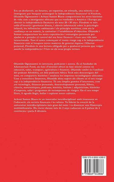 Ets un desfavorit, un foraster, un expatriat, un nòmada, una minoria o un immigrant que busques aconseguir la independència financera? A Firedom, Olumide Ogunsanwo i Achani Samon Biaou comparteixen les seves històries de vida com a immigrants africans que es traslladen a Amèrica i Europa per obtenir la independència financera als seus 20 i 30 anys. Firedom va més enllà d'invertir i gestionar diners, i ofereix informació sobre la psicologia infantil, les influències ambientals i els principis nutritius, com ara la confiança en un mateix, la curiositat i l'establiment d'objectius. Olumide i Samon comparteixen les seves experiències i estratègies personals per ajudar-te a prendre el control del teu futur financer i viure una vida més intencionada. Tant si esteu començant el vostre viatge cap a la independència financera com si busqueu noves maneres de generar riquesa i llibertat personal, Firedom és una lectura obligada per a qualsevol persona que vulgui assolir la independència i l'èxit en els seus propis termes.