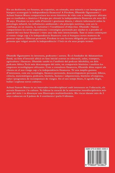 Ets un desfavorit, un foraster, un expatriat, un nòmada, una minoria o un immigrant que busques aconseguir la independència financera? A Firedom, Olumide Ogunsanwo i Achani Samon Biaou comparteixen les seves històries de vida com a immigrants africans que es traslladen a Amèrica i Europa per obtenir la independència financera als seus 20 i 30 anys. Firedom va més enllà d'invertir i gestionar diners, i ofereix informació sobre la psicologia infantil, les influències ambientals i els principis nutritius, com ara la confiança en un mateix, la curiositat i l'establiment d'objectius. Olumide i Samon comparteixen les seves experiències i estratègies personals per ajudar-te a prendre el control del teu futur financer i viure una vida més intencionada. Tant si esteu començant el vostre viatge cap a la independència financera com si busqueu noves maneres de generar riquesa i llibertat personal, Firedom és una lectura obligada per a qualsevol persona que vulgui assolir la independència i l'èxit en els seus propis termes.