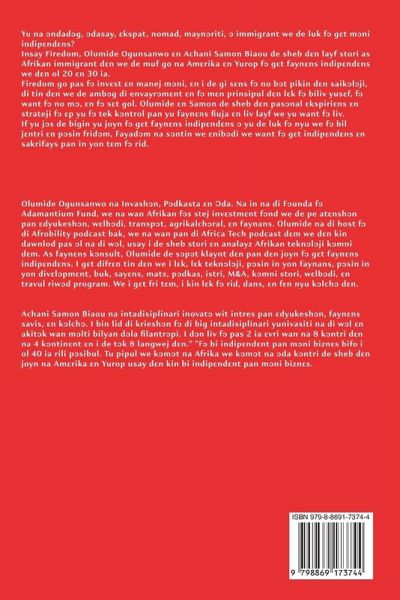 Dis buk na f¿ pipul d¿n we k¿m¿t na do, pipul d¿n we k¿m¿t na ¿da k¿ntri, pipul d¿n we de waka waka, pipul d¿n we n¿ b¿ku, pipul d¿n we k¿m¿t na ¿da k¿ntri ¿n ¿nib¿di we want f¿ liv d¿n layf wit m¿ bay wilful. Olumide ¿n Samon n¿ j¿s de t¿k b¿t inv¿stism¿nt ¿n p¿sin in yon faynans, b¿t d¿n de t¿k bak b¿t di saik¿l¿ji ¿n infl¿¿ns we pikin g¿t, f¿ g¿t k¿nfid¿ns pan yus¿f, f¿ div¿l¿p want f¿ no m¿ ¿n f¿ s¿t gol f¿ div¿l¿p ¿n impruv di prinsipul d¿n we de alaw yu f¿ liv yu layf l¿k aw yu want.