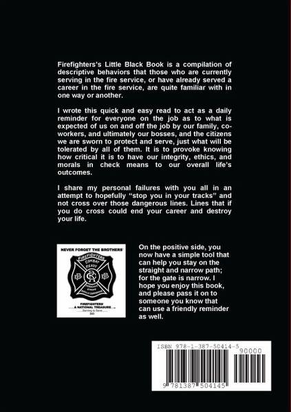 Firefighters's Little Black Book is a compilation of descriptive behaviors that those who are currently serving in the fire service, or have already served a career in the fire service, are quite familiar with in one way or another. I wrote this quick and easy read to act as a daily reminder for everyone on the job as to what is expected of us on and off the job by our family, co-workers, and ultimately our bosses, and the citizens we are sworn to protect and serve, just what will be tolerated by all of them. It is to provoke knowing how critical it is to have our integrity, ethics, and morals in check means to our overall life's outcomes. I share my personal failures with you all in an attempt to hopefully "stop you in your tracks" and not cross over those dangerous lines. Lines that if you do cross could end your career and destroy your life.