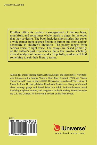 Fireflies offers its readers a smorgasbord of literary bites, mouthfuls, and sometimes whole meals to digest in the order that they so desire. The book includes short stories that cover a wide gamut from science fiction to humor and from action/adventure to children's literature. The poetry ranges from serious verse to light verse. The essays are based primarily on the author's past experiences, but a few involve scholarly critical analysis of famous works. Hopefully, readers will find something to suit their literary tastes.