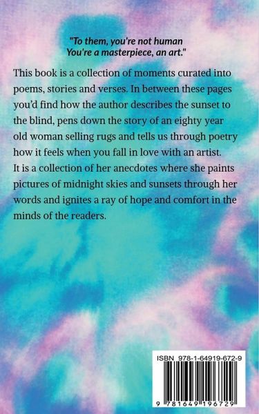 This book is a collection of moments curated into poems, stories and verses. In between these pages you’d find how the author describes the sunset to the blind, pens down the story of an eighty year old woman selling rugs and tells us through poetry how it feels when you fall in love with an artist. It is a collection of her anecdotes where she paints pictures of midnight skies and sunsets through her words and ignites a ray of hope and comfort in the minds of the readers.