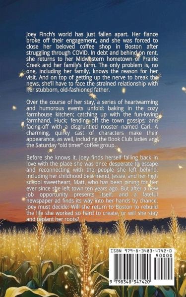 This heartwarming, humorous debut novella celebrates the magic of small town and country life. Joey Finch's world has just fallen apart. Her fiancé broke off their engagement, and she was forced to close her beloved coffee shop in Boston after struggling through COVID. In debt and behind on rent, she returns to her Midwestern hometown of Prairie Creek and her family's farm. The only problem is, no one, including her family, knows the reason for her visit. And on top of getting up the nerve to break the news, she'll have to face the strained relationship with her stubborn, old-fashioned father. Over the course of her stay, a series of heartwarming and humorous events unfold: baking in the cozy farmhouse kitchen; catching up with the fun-loving farmhand, Huck; fending off the town gossips; and facing-off with a disgruntled rooster named Carl. A charming, quirky cast of characters make their appearance, as well, including the Book Club ladies and the Saturday "old timer" coffee group. Before she knows it, Joey finds herself falling back in love with the place she was once desperate to escape and reconnecting with the people she left behind, including her childhood best friend, Jessie, and her high school sweetheart, Matt, who has been pining for her ever since she left town ten years ago. But after a new job opportunity presents itself, and a fateful newspaper ad finds its way into her hands by chance, Joey must decide: Will she return to Boston to rebuild the life she worked so hard to create, or will she stay and replant her roots?