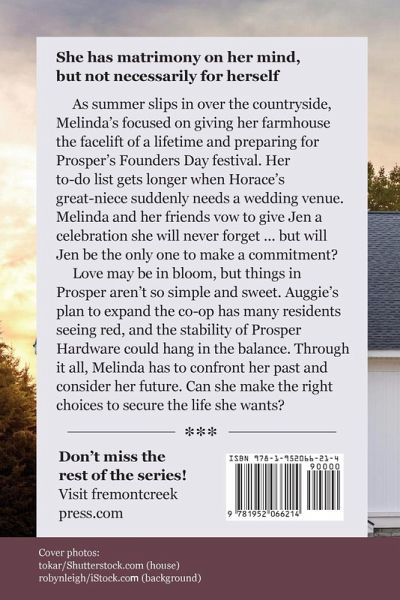 She has matrimony on her mind ... but not necessarily for herself. As summer slips in over the countryside, Melinda's focused on giving her farmhouse the facelift of a lifetime and planning Prosper's first Founders Day festival. Her to-do list gets longer when Horace's great-niece suddenly needs a wedding venue. Melinda and her friends vow to give Jen a celebration she will never forget ... but will Jen be the only one to make a commitment? Love may be in bloom, but things in Prosper aren't so simple and sweet. Auggie's grand plan to expand the co-op has many residents seeing red, and the stability of Prosper Hardware could hang in the balance. And when a beloved community member is sidelined, an unexpected visitor is determined to pick up the slack. Through it all, Melinda has to confront her past and consider her future. Can she make the right choices to secure the life she wants? Don't miss the final installment in this heartwarming series!