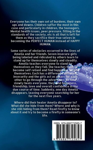 Everyone has their own set of burdens, their own ups and downs. In this period only the close ones help the children in overcoming these obstacles. Children suffer the most in this case and in children, its specifically the teenagers. Mental health issues, peer pressure, fitting in the standards of the society, etc is all that is left for them as they sacrifice their true selves in becoming the PERFECT HUMAN instead of HAPPY HUMAN. Same series of obstacles occurred in the lives of Amelia and her friends. Seven insecure girls being labeled and ridiculed by others learn to stand up for themselves slowly and steadily. Amelia teaches everyone to stand by themselves as they fall. She teaches them to become self reliant and find happiness within themselves. Each has a different a different insecurity and the girls act as pillars for each other to go through the adversities. As time slowly heals everyone, they find happiness, friendship, love and overall confidence in the due course of time. Suddenly, one day Amelia disappears, leaving everyone searching for her for the next five years. Where did their healer Amelia disappear to? What did she hide from them? Where and why is she still hiding from them? Read Firefly to know about it and try to become a firefly in someone’s life.