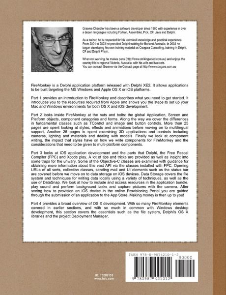 FireMonkey is Embarcadero's new cross-platform application platform for Delphi. With FireMonkey, applications can be developed for iOS, OS X and Windows. Part 1 introduces FireMonkey and describes what you need to get started: the resources required from Apple and the steps needed to set up your Mac and Windows environments for both OS X and iOS development. Part 2 looks at styles, effects and animations, multilingual support, 3D applications and controls including cameras, lighting and materials and dealing with models. Part 3 looks at iOS application development, including resources in the application bundle, playing sound, performing background tasks and using the camera. We see how to provision an iOS device in the Provisioning Portal and submit an application to the App Store. Part 4 provides a broad overview of OS X development. This section covers the essentials such as the file system, Delphi's OS X libraries and the project Deployment Manager.