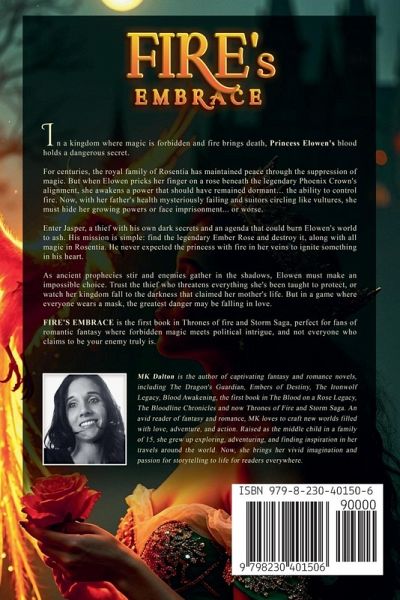 In a kingdom where magic is forbidden and fire brings death, Princess Elowen's blood holds a dangerous secret. For centuries, the royal family of Rosentia has maintained peace through the suppression of magic. But when Elowen pricks her finger on a rose beneath the legendary Phoenix Crown's alignment, she awakens a power that should have remained dormant... the ability to control fire. Now, with her father's health mysteriously failing and suitors circling like vultures, she must hide her growing powers or face imprisonment... or worse. Enter Jasper, a thief with his own dark secrets and an agenda that could burn Elowen's world to ash. His mission is simple: find the legendary Ember Rose and destroy it, along with all magic in Rosentia. He never expected the princess with fire in her veins to ignite something in his heart. As ancient prophecies stir and enemies gather in the shadows, Elowen must make an impossible choice. Trust the thief who threatens everything she's been taught to protect, or watch her kingdom fall to the darkness that claimed her mother's life. But in a game where everyone wears a mask, the greatest danger may be falling in love. FIRE'S EMBRACE is the first book in Thrones of fire and Storm Saga, perfect for fans of romantic fantasy where forbidden magic meets political intrigue, and not everyone who claims to be your enemy truly is.