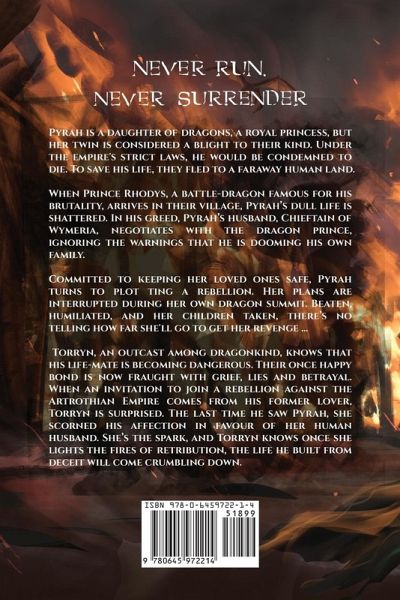 Never Run. Never Surrender. Pyrah is a daughter of dragons, a royal princess, but her twin is considered empty and a blight on dragonkind. Under the empires strict laws, he's condemned to die. To save his life, they fled. Years later Pyrah's dull life is shattered with the arrival of Prince Rhodys, a battle-dragon famous for his brutality. In his greed, Pyrah's husband, Chieftain of Wymeria, negotiates with the dragon prince, ignoring the warnings that he is dooming his own family. Committed to keeping her loved ones safe, Pyrah plots a rebellion. But her plans are interrupted. She is beaten, humiliated, and her children taken. Now there's no telling how far she'll go or what she would risk in order to get her revenge ... Torryn, an outcast among dragonkind, knows that his life-mate is becoming dangerous. Their once happy bond is now fraught with grief, lies and betrayal. When an invitation to join a rebellion against the Artrothian Empire comes from his former lover, Torryn is surprised. The last time he saw Pyrah, she scorned his affection in favour of her human husband. She's the spark, and Torryn knows once she lights the fires of retribution, the life he built from deceit will come crumbling down.
