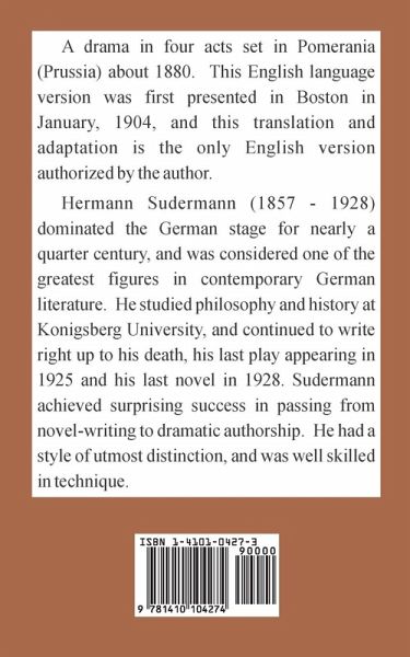 A drama in four acts set in Pomerania (Prussia) about 1880. This English language version was first presented in Boston in January, 1904, and this translation and adaptation is the only English version authorized by the author. Hermann Sudermann (1857 - 1928) dominated the German stage for nearly a quarter century, and was considered one of the greatest figures in contemporary German literature. He studied philosophy and history at Konigsberg University, and continued to write right up to his death, his last play appearing in 1925 and his last novel in 1928. Sudermann achieved surprising success in passing from novel-writing to dramatic authorship. He had a style of utmost distinction, and was well skilled in technique.