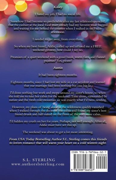 Kristy I hated my job. I had no social life. Somehow I had become so predictable after my last relationship ended, that the cashier at the local food mart already had my favorite wine bagged and waiting for me behind the counter when I walked in on Friday afternoon. I needed to get away, from everything. So when my best friend, Addie, called up and offered me a FREE weekend getaway, how could I say no. Promises of a quiet weekend with a good book, warm fires, and flannel pajamas? Yes, please! Austin It had been eighteen months. Eighteen months, since I had lost my wife in a car accident and learned that our marriage had been nothing but one big lie. I'd done nothing but work and mope around my sister's house, so when she told me to take her cabin for the weekend. Time alone, surrounded by nature and the fresh cold mountain air was exactly what I'd been needing. However, my plans of being alone in the wilderness quickly vanished when I walked through the doors of the cabin and found my sister's best friend drunk and half-naked on the floor of the very same cabin. I'd hidden my crush on her for years. Perhaps, not well enough. After all, Addie must have set this up. The weekend was about to get a lot more interesting. From USA Today Bestselling Author S.L. Sterling comes this friends to lovers romance that will warm your heart on a cold winters night.