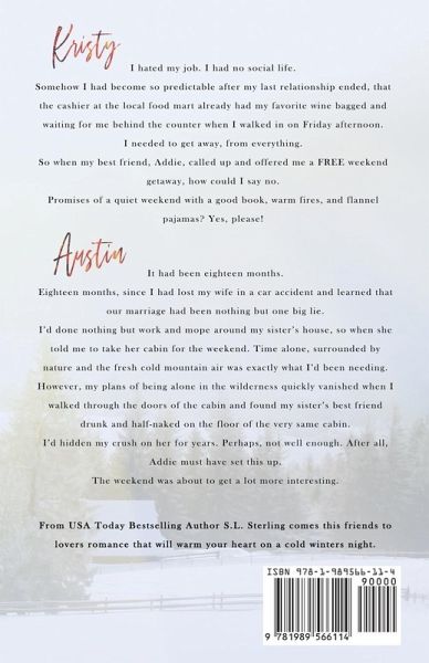 .Kristy I hated my job. I had no social life. Somehow I had become so predictable after my last relationship ended, that the cashier at the local food mart already had my favorite wine bagged and waiting for me behind the counter when I walked in on Friday afternoon. I needed to get away, from everything. So when my best friend, Addie, called up and offered me a FREE weekend getaway, how could I say no. Promises of a quiet weekend with a good book, warm fires, and flannel pajamas? Yes, please! Austin It had been eighteen months. Eighteen months, since I had lost my wife in a car accident and learned that our marriage had been nothing but one big lie. I'd done nothing but work and mope around my sister's house, so when she told me to take her cabin for the weekend. Time alone, surrounded by nature and the fresh cold mountain air was exactly what I'd been needing. However, my plans of being alone in the wilderness quickly vanished when I walked through the doors of the cabin and found my sister's best friend drunk and half-naked on the floor of the very same cabin. I'd hidden my crush on her for years. Perhaps, not well enough. After all, Addie must have set this up. The weekend was about to get a lot more interesting. From USA Today Bestselling Author S.L. Sterling comes this friends to lovers romance that will warm your heart on a cold winters night.