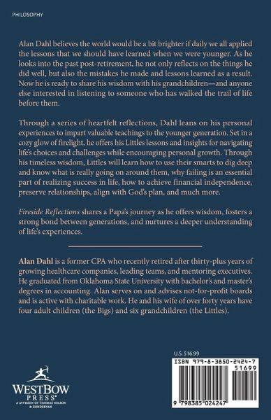 Alan Dahl believes the world would be a bit brighter if daily we all applied the lessons that we should have learned when we were younger. As he looks into the past post-retirement, he not only reflects on the things he did well, but also the mistakes he made and lessons learned as a result. Now he is ready to share his wisdom with his grandchildren-and anyone else interested in listening to someone who has walked the trail of life before them. Through a series of heartfelt reflections, Dahl leans on his personal experiences to impart valuable teachings to the younger generation. Set in a cozy glow of firelight, he offers his Littles lessons and insights for navigating life's choices and challenges while encouraging personal growth. Through his timeless wisdom, Littles will learn how to use their smarts to dig deep and know what is really going on around them, why failing is an essential part of realizing success in life, how to achieve financial independence, preserve relationships, align with God's plan, and much more. Fireside Reflections shares a Papa's journey as he offers wisdom, fosters a strong bond between generations, and nurtures a deeper understanding of life's experiences.
