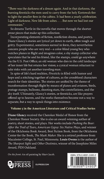 Incorporating elements of fiction, nonfiction, drama, and poetry, Diane Glancy's stories are lyrical yet down to earth, often tough and gritty. Experimental, sometimes surreal in form, they nevertheless concern people who are very real-a color-blind young boy who watches planes in flight and imagines color; a shy stamp collector who speculates that he and his friend, like the stamps, could go anywhere via the U.S. Post Office; an old woman who dies in the cold landscape of her inner life but retains her vision; a cynical woman reluctant to take risks with yet another traveling man. In spite of life's hard realities, Firesticks is filled with humor and hope and a stitching together of cultures, as the crossblood characters search for their identities.