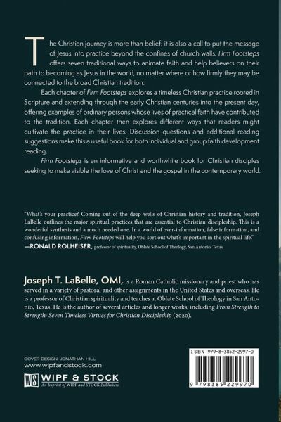 The Christian journey is more than belief; it is also a call to put the message of Jesus into practice beyond the confines of church walls. Firm Footsteps offers seven traditional ways to animate faith and help believers on their path to becoming as Jesus in the world, no matter where or how firmly they may be connected to the broad Christian tradition. Each chapter of Firm Footsteps explores a timeless Christian practice rooted in Scripture and extending through the early Christian centuries into the present day, offering examples of ordinary persons whose lives of practical faith have contributed to the tradition. Each chapter then explores different ways that readers might cultivate the practice in their lives. Discussion questions and additional reading suggestions make this a useful book for both individual and group faith development reading. Firm Footsteps is an informative and worthwhile book for Christian disciples seeking to make visible the love of Christ and the gospel in the contemporary world.