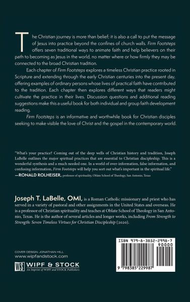 The Christian journey is more than belief; it is also a call to put the message of Jesus into practice beyond the confines of church walls. Firm Footsteps offers seven traditional ways to animate faith and help believers on their path to becoming as Jesus in the world, no matter where or how firmly they may be connected to the broad Christian tradition. Each chapter of Firm Footsteps explores a timeless Christian practice rooted in Scripture and extending through the early Christian centuries into the present day, offering examples of ordinary persons whose lives of practical faith have contributed to the tradition. Each chapter then explores different ways that readers might cultivate the practice in their lives. Discussion questions and additional reading suggestions make this a useful book for both individual and group faith development reading. Firm Footsteps is an informative and worthwhile book for Christian disciples seeking to make visible the love of Christ and the gospel in the contemporary world.