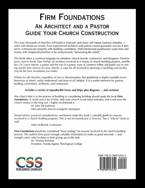 This year, thousands of churches will build or renovate, and many will repeat common mistakes -- some with disastrous results. Even experienced architects and pastors cannot guarantee success if they fail to communicate properly with building committees. Well-intentioned parishioners waste time and money with misplaced priorities or by unnecessarily "re-inventing the wheel." This book offers a common language for ministers, church boards, contractors, and designers. Point by point, start to finish, Mr. Dan Michal, an architect involved in a variety of church building projects, and the Rev. Dr. Lance Moore, a pastor and the son of a pastor, warn of common follies and guide you in sorting out the best choices for your church. A copy for all involved in planning or building your facility may be the best investment you make! Written for all churches, regardless of size or denomination, this guidebook is highly readable (even humorous at times), easily understood, and most of all, helpful. It is a useful reference for pastors, building committees, architects, and contractors. Includes a variety of reproducible forms and helps, plus diagrams... and cartoons! Any church that is in the process of building or considering building should study the book Firm Foundations. It could save a lot of time, help your church avoid many mistakes, and it will save the church money in the long run. I highly recommend it. Dr. John Ed Mathison Internationally known evangelist and pastor Sound advice, practical considerations and humor make this book a valuable guide for anyone involved in a church building program. This is not necessarily just a "how-to," but a "why-to" book as well. Mike Holbrook, Contractor Firm Foundations should be considered "must reading" for anyone involved in the church building process. The authors have given enough valuable information to make us good stewards -- and enough comic relief to keep us from giving up on the task. Dr. Thomas Kinchen, President Florida Baptist Theological College