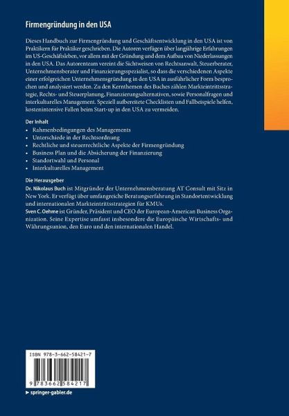 Dieses Handbuch zur Firmengründung und Geschäftsentwicklung in den USA ist von Praktikern für Praktiker geschrieben. Die Autoren verfügen über langjährige Erfahrungen im US-Geschäftsleben, vor allem mit der Gründung und dem Aufbau von Niederlassungen in den USA. Das Autorenteam vereint die Sichtweisen von Rechtsanwalt, Steuerberater, Unternehmensberater und Finanzierungsspezialist, so dass die verschiedenen Aspekte einer erfolgreichen Unternehmensgründung in den USA in ausführlicher Form besprochen und analysiert werden. Zu den Kernthemen des Buches zählen Markteintrittsstrategie, Rechts- und Steuerplanung, Finanzierungsalternativen, sowie Personalfragen und interkulturelles Management. Speziell aufbereitete Checklisten und Fallbeispiele helfen, kostenintensive Fallen beim Start-up in den USA zu vermeiden.
