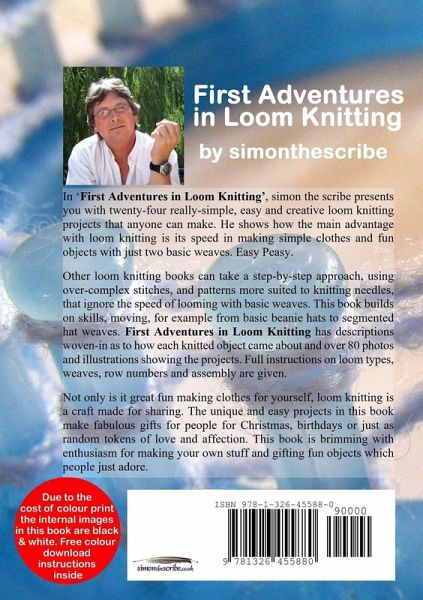 In 'First Adventures in Loom Knitting', simonthescribe presents you with twenty-four really-simple, easy, original and creative loom knitting projects that anyone can make. He shows how the main advantage with loom knitting is its speed in making simple clothes and fun objects with just two basic weaves. Other loom knitting books can take a step-by-step approach, using over-complex stitches and patterns more suited to knitting needles, that ignore the speed of looming with basic weaves. First Adventures in Loom Knitting has descriptions woven-in as to how each knitted object came about and over 80 photos and illustrations showing the projects. Full instructions on loom types, weaves, row numbers and assembly are given. Not only is it great fun making clothes and woven items for yourself, loom knitting is a craft made for sharing. The unique and easy projects in this book make fabulous gifts for people for Christmas, birthdays or just as random tokens of love and affection.