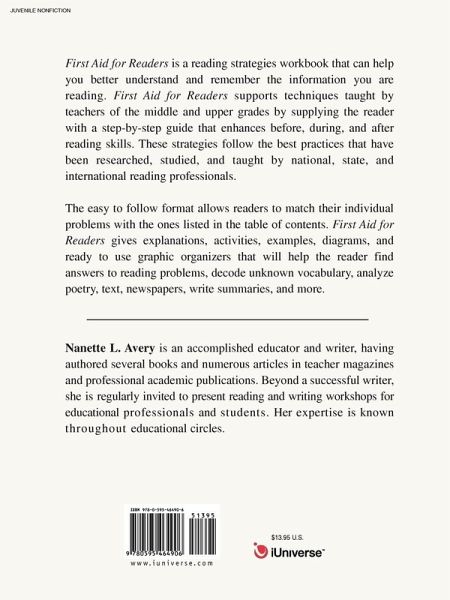 First Aid for Readers is a reading strategies workbook that can help you better understand and remember the information you are reading. First Aid for Readers supports techniques taught by teachers of the middle and upper grades by supplying the reader with a step-by-step guide that enhances before, during, and after reading skills. These strategies follow the best practices that have been researched, studied, and taught by national, state, and international reading professionals. The easy to follow format allows readers to match their individual problems with the ones listed in the table of contents. First Aid for Readers gives explanations, activities, examples, diagrams, and ready to use graphic organizers that will help the reader find answers to reading problems, decode unknown vocabulary, analyze poetry, text, newspapers, write summaries, and more.