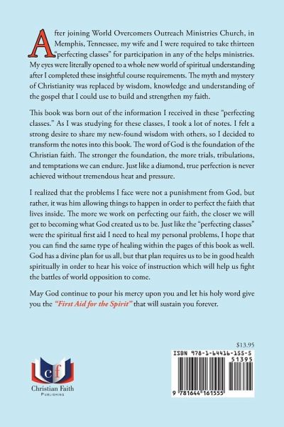 After joining World Overcomers Outreach Ministries Church, in Memphis, Tennessee, my wife and I were required to take thirteen "perfecting classes" for participation in any of the helps ministries. My eyes were literally opened to a whole new world of spiritual understanding after I completed these insightful course requirements. The myth and mystery of Christianity was replaced by wisdom, knowledge and understanding of the gospel that I could use to build and strengthen my faith. This book was born out of the information I received in these "perfecting classes." As I was studying for these classes, I took a lot of notes. I felt a strong desire to share my new-found wisdom with others, so I decided to transform the notes into this book. The word of God is the foundation of the Christian faith. The stronger the foundation, the more trials, tribulations, and temptations we can endure. Just like a diamond, true perfection is never achieved without tremendous heat and pressure. I realized that the problems I face were not a punishment from God, but rather, it was him allowing things to happen in order to perfect the faith that lives inside. The more we work on perfecting our faith, the closer we will get to becoming what God created us to be. Just like the "perfecting classes" were the spiritual first aid I need to heal my personal problems, I hope that you can find the same type of healing within the text of this writings as well. God has a divine plan for us all, but that plan requires us to be in good health spiritually in order to hear his voice of instruction which will help us fight the battles of world opposition to come. May God continue to pour his mercy upon you and let his holy word give you the "First Aid for the Spirit" that will sustain you forever.