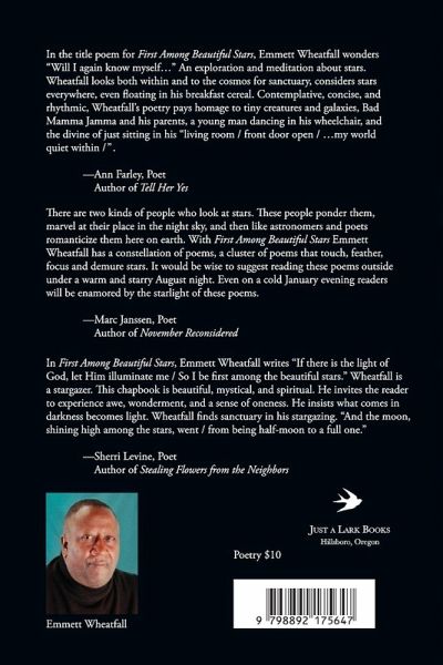 First Among Beautiful Stars, by Emmett Wheatfall, is a book of poetry. These lyrical meditations invite the reader to experience awe, wonderment, and a sense of oneness by proposing that what comes in darkness becomes light. Wheatfall finds sanctuary in his stargazing. "And the moon, shining high among the stars, went / from being half-moon to a full one." In the title poem for First Among Beautiful Stars, Wheatfall looks both within and to the cosmos for sanctuary, considers stars everywhere, even floating in his breakfast cereal. Contemplative, concise, and rhythmic, Wheatfall's poetry pays homage to tiny creatures and galaxies, and the divine of just sitting in his "living room / front door open / ...my world quiet within /".
