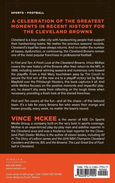 A celebration of the greatest moments in recent history for the Cleveland Browns Cleveland is a blue-collar city with hardworking people that support their hardworking teams. No matter the previous seasons' records, Cleveland's loyal fan base always returns. And no matter the amount of losses, dysfunction, or controversy, the Cleveland Browns remain one of the most popular franchises in professional football. In First and Ten: A Fresh Look at the Cleveland Browns, Vince McKee covers the new history of the Browns after their return to the NFL in 1999, including several winning seasons and numerous runs toward the playoffs. From a Hail Mary touchdown pass by Tim Couch to secure the first victory of the new era to a playoff victory led by Baker Mayfield over the Pittsburgh Steelers, this book captures it all. And while McKee focuses on the positive moments and impactful players, he doesn't shy away from reflecting on the negatives when necessary, providing a fresh look at this storied franchise. First and Ten covers all the fun-and sometimes the chaos-of this beloved team. It's a tale for every Browns fan who wears their orange and brown proudly, every week, no matter the team's record.