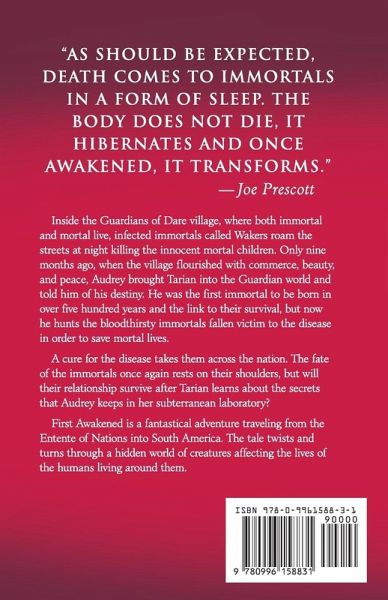 "As should be expected, death comes to immortals in a form of sleep. The body does not die, it hibernates and once awakened, it transforms " - Joe Prescott Inside the Guardians of Dare village, where both immortal and mortal live, infected immortals called Wakers now roam the streets at night killing the innocent mortal children. Only nine months ago, when the village flourished with commerce, beauty, and peace, Audrey brought Tarian into the Guardian world and told him of his destiny. He was the first immortal to be born in over five hundred years and the link to their survival, but now he hunts the bloodthirsty immortals fallen victim to the disease in order to save mortal lives. A cure for the disease takes them across the nation. The fate of the immortals once again rests on their shoulders, but will their relationship survive after Tarian learns about the secrets that Audrey keeps in her subterranean laboratory? First Awakened is a fantastical adventure traveling from the Entente of Nations into South America. The tale twists and turns through a hidden world of creatures affecting the lives of the humans living around them.