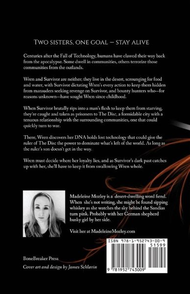 Two sisters, one goal-stay alive. Centuries after the Fall of Technology, humans have clawed their way back from the apocalypse. Some dwell in communities, others terrorize those communities from the outlands. Wren and Survivor are neither; they live in the desert, scrounging for food and water, with Survivor dictating Wren's every action to keep them hidden from marauders seeking revenge on Survivor, and bounty hunters who-for reasons unknown-have sought Wren since childhood. When Survivor brutally rips into a man's flesh to keep them from starving, they're caught and taken as prisoners to The Disc, a formidable city with a tenuous relationship with the surrounding communities, one that could quickly turn to war. There, Wren discovers her DNA holds lost technology that could give the ruler of The Disc the power to dominate what's left of the world. As long as the ruler's son doesn't get in the way. Wren must decide where her loyalty lies, and as Survivor's dark past catches up with her, she'll have to keep it from swallowing Wren whole.