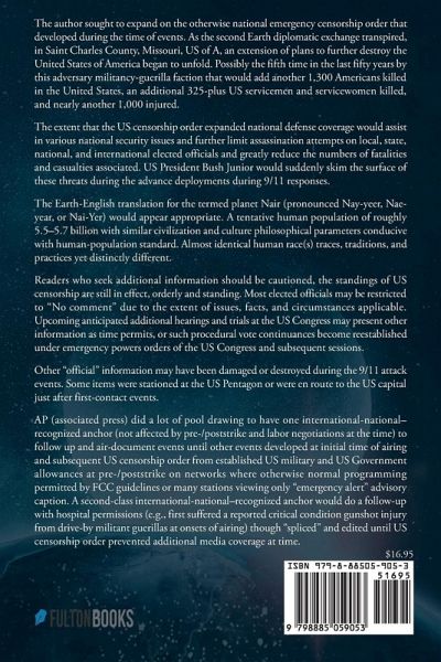 The author sought to expand on the otherwise national emergency censorship order that developed during the time of events. As the second Earth diplomatic exchange transpired, in Saint Charles County, Missouri, US of A, an extension of plans to further destroy the United States of America began to unfold. Possibly the fifth time in the last fifty years by this adversary militancy-guerilla faction that would add another 1,300 Americans killed in the United States, an additional 325-plus US servicemen and servicewomen killed, and nearly another 1,000 injured. The extent that the US censorship order expanded national defense coverage would assist in various national security issues and further limit assassination attempts on local, state, national, and international elected officials and greatly reduce the numbers of fatalities and casualties associated. US President Bush Junior would suddenly skim the surface of these threats during the advance deployments during 9/11 responses. The Earth-English translation for the termed planet Nair (pronounced Nay-yeer, Nae-year, or Nai-Yer) would appear appropriate. A tentative human population of roughly 5.5-5.7 billion with similar civilization and culture philosophical parameters conducive with human-population standard. Almost identical human race(s) traces, traditions, and practices yet distinctly different. Readers who seek additional information should be cautioned, the standings of US censorship are still in effect, orderly and standing. Most elected officials may be restricted to "No comment" due to the extent of issues, facts, and circumstances applicable. Upcoming anticipated additional hearings and trials at the US Congress may present other information as time permits, or such procedural vote continuances become reestablished under emergency powers orders of the US Congress and subsequent sessions. Other "official" information may have been damaged or destroyed during the 9/11 attack events. Some items were stationed at the US Pentagon or were en route to the US capital just after first-contact events. AP (associated press) did a lot of pool drawing to have one international-national-recognized anchor (not affected by pre-/poststrike and labor negotiations at the time) to follow up and air-document events until other events developed at initial time of airing and subsequent US censorship order from established US military and US Government allowances at pre-/poststrike on networks where otherwise normal programming permitted by FCC guidelines or many stations viewing only "emergency alert" advisory caption. A second-class international-national-recognized anchor would do a follow-up with hospital permissions (e.g., first suffered a reported critical condition gunshot injury from drive-by militant guerillas at onsets of airing) though "spliced" and edited until US censorship order prevented additional media coverage at time.