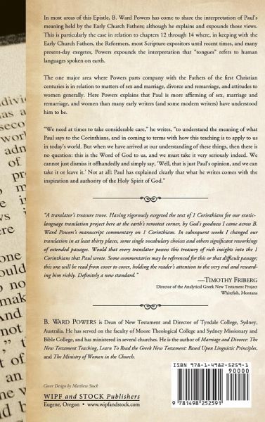 In most areas of this Epistle, B. Ward Powers has come to share the interpretation of Paul's meaning held by the Early Church Fathers; although he explains and expounds those views. This is particularly the case in relation to chapters 12 through 14 where, in keeping with the Early Church Fathers, the Reformers, most Scripture expositors until recent times, and many present-day exegetes, Powers expounds the interpretation that ""tongues"" refers to human languages spoken on earth. The one major area where Powers parts company with the Fathers of the first Christian centuries is in relation to matters of sex and marriage, divorce and remarriage, and attitudes to women generally. Here Powers explains that Paul is more affirming of sex, marriage and remarriage, and women than many early writers (and some modern writers) have understood him to be. ""We need at times to take considerable care,"" he writes, ""to understand the meaning of what Paul says to the Corinthians, and in coming to terms with how this teaching is to apply to us in today's world. But when we have arrived at our understanding of these things, then there is no question: this is the Word of God to us, and we must take it very seriously indeed. We cannot just dismiss it offhandedly and simply say, 'Well, that is just Paul's opinion, and we can take it or leave it.' Not at all: Paul has explained clearly that what he writes comes with the inspiration and authority of the Holy Spirit of God.""