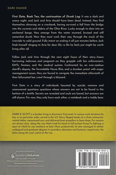First Date, Book Two, the continuation of Drunk Log: It was a dark and snowy night, and Jack and Aria should have been dead. Instead, they find themselves shivering on a riverbank, having survived a fall from the bridge into the currents and debris of the Ohio River. Lucky enough to slam into an anchored barge, they emerge from the water stunned, bruised and still somewhat drunk. Now they must work their way through the muck of the riverside to solid ground. Fully intent on ending it all just minutes before, Jack finds himself clinging to Aria for dear life-a life he feels just might be worth living after all. Follow Jack and Aria through the next eight hours of their story-hours harrowing, ludicrous and poignant-as they grapple with law enforcement, EMTs, firemen, and the medical system. Confronted by an over-zealous sheriff's deputy, the formidable Nurse Rita, and a drunken priest with anger management issues, they are forced to navigate the immediate aftermath of their bifurcated bar crawl through a blizzard. First Date is a story of individuals haunted by suicide, remorse and unanswered questions: questions whose answers are not to be found in the bottom of a bottle. Secrets are revealed and souls are bared, but answers are still elusive. For now, they only have each other, a notebook and a teddy bear.