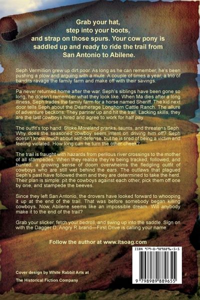 Grab your hat, step into your boots, and strap on those spurs. Your cow pony is saddled up and ready to ride the trail from San Antonio to Abilene. Seph Vermillion grew up dirt poor. As long as he can remember, he's been pushing a plow and arguing with a mule. A couple of times a year, a trio of bandits ravage the family farm and make off with their savings. Pa never returned home after the war. Seph's siblings have been gone so long, he doesn't remember what they look like. When Ma dies after a long illness, Seph trades the family farm for a horse named Sheriff. The kid next door tells Seph about the Deatherage Longhorn Cattle Ranch. The allure of adventure beckons. They partner up and hit the trail. Lacking skills, they are the last cowboys hired and agree to work for half pay. The outfit's top hand, Stoke Moreland, pranks, taunts, and threatens Seph. Why does the seasoned cowboy seem intent on driving him off? Seph doesn't know much about self-defense, but he is tired of being a victim and feeling violated. How long can he turn the other cheek? The trail is fraught with hazards from perilous river crossings to the mother of all stampedes. When they realize they're being tracked, followed, and hunted, a growing sense of doom overwhelms the fledgling outfit of cowboys who are still wet behind the ears. The outlaws that plagued Seph's past have followed them and they are determined to take the herd. Their plan is simple: pit the cowboys against each other, pick them off one by one, and stampede the beeves. Since they left San Antonio, the drovers have looked forward to whooping it up at the end of the trail. That was before somebody began killing cowboys. Now, Abilene seems like an impossible dream. Will anybody make it to the end of the trail? Grab your slicker, fetch your bedroll, and swing up into the saddle. Sign on with the Dagger D, Angry R brand-First Drive is calling your name.