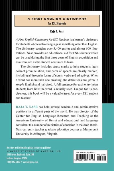 This learner's dictionary for students whose native language is other than English is a unique and educational aid for more than 3,400 words. Author Raja Nasr details primary stress, part(s) of speech, and various meanings in simple English. Nasr also provides almost 600 illustrations of the words.