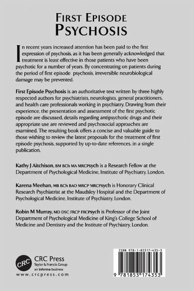 Why Focus on the First Episode? The Presentation and Assessment of the First Psychotic Episode. Before the Onset of Frank Psychosis. Antipsychotics - Psychopharmacology.Prescribing for Psychotic Symptoms. Prescribing for Affective, Anxiety, and Other Comorbid Symptoms. Recovery and Rehabilitation I: The Acute Episode and Its Aftermath. Recovery and Rehabilitation II: Enhancing Recovery and Relapse Prevention. Key ServiceElements and Models Used to Date