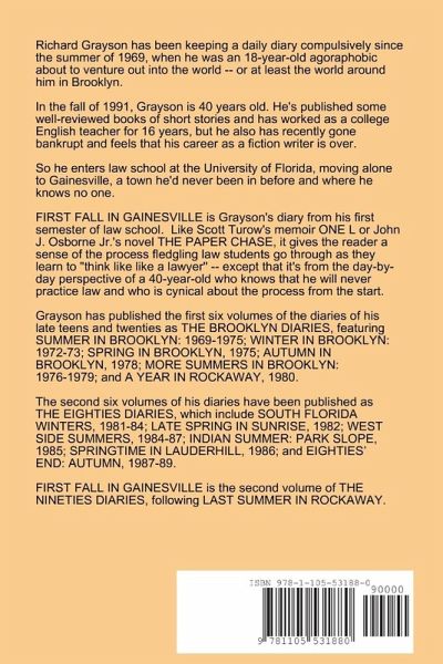 In the fall of 1991, Grayson is 40 years old. He's published some well-reviewed books of short stories and has worked as a college English teacher for 16 years, but he also has recently gone bankrupt and feels that his career as a fiction writer is over. So he enters law school at the University of Florida, moving alone to Gainesville, a town he'd never been in before and where he knows no one. FIRST FALL IN GAINESVILLE is Grayson's diary from his first semester of law school. Like Scott Turow's memoir ONE L or John J. Osborne Jr.'s novel THE PAPER CHASE, it gives the reader a sense of the process fledgling law students go through as they learn to "think like like a lawyer" -- except that it's from the day-by-day perspective of a 40-year-old who knows that he will never practice law and who is cynical about the process from the start.
