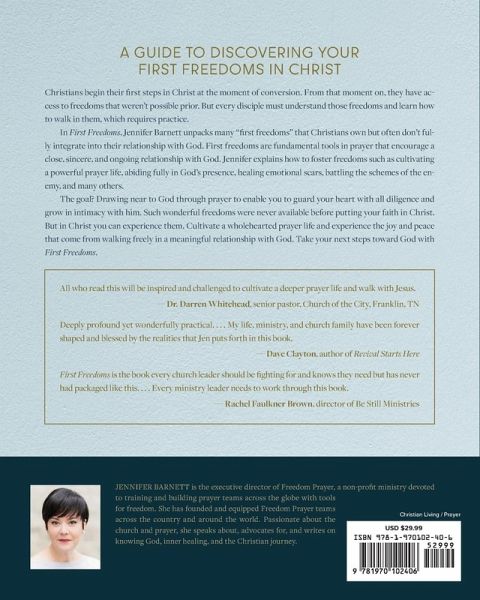 A GUIDE TO DISCOVERING YOUR FIRST FREEDOMS IN CHRIST Christians begin their first steps in Christ at the moment of conversion. From that moment on, they have access to freedoms that weren't possible prior. But every disciple must understand those freedoms and learn how to walk in them, which requires practice. In First Freedoms, Jennifer Barnett unpacks many "first freedoms" that Christians own but often don't fully integrate into their relationship with God. First freedoms are fundamental tools in prayer that encourage a close, sincere, and ongoing relationship with God. Jennifer explains how to foster freedoms such as cultivating a powerful prayer life, abiding fully in God's presence, healing emotional scars, battling the schemes of the enemy, and many others. The goal? Drawing near to God through prayer to enable you to guard your heart with all diligence and grow in intimacy with him. Such wonderful freedoms were never available before putting your faith in Christ. But in Christ you can experience them. Cultivate a wholehearted prayer life and experience the joy and peace that come from walking freely in a meaningful relationship with God. Take your next steps toward God with First Freedoms. All who read this will be inspired and challenged to cultivate a deeper prayer life and walk with Jesus. - Dr. Darren Whitehead, senior pastor, Church of the City, Franklin, TN Deeply profound yet wonderfully practical. . . . My life, ministry, and church family have been forever shaped and blessed by the realities that Jen puts forth in this book. - Dave Clayton, author of Revival Starts Here First Freedoms is the book every church leader should be fighting for and knows they need but has never had packaged like this. . . . Every ministry leader needs to work through this book. - Rachel Faulkner Brown, director of Be Still Ministries JENNIFER BARNETT is the executive director of Freedom Prayer, a non-profit ministry devoted to training and building prayer teams across the globe with tools for freedom. She has founded and equipped Freedom Prayer teams across the country and around the world. Passionate about the church and prayer, she speaks about, advocates for, and writes on knowing God, inner healing, and the Christian journey.