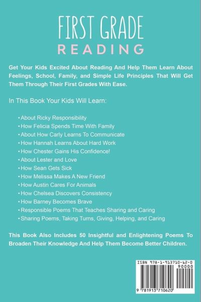 GET YOUR KIDS TO FALL IN LOVE WITH READING WITH THIS FUN AND EDUCATIONAL BOOK TODAY! Get Your Kids Excited About Reading And Help Them Learn About Feelings, School, Family, and Simple Life Principles That Will Get Them Through Their First Grades With Ease. This Book Also Includes 50 Insightful and Enlightening Poems To Broaden Their Knowledge And Help Them Become Better Children. In This Book Your Kids Will Learn:About Ricky Responsibility How Felicia Spends Time With Family About How Carly Learns To Communicate How Hannah Learns About Hard Work How Chester Gains His Confidence! About Lester and Love How Sean Gets Sick How Melissa Makes A New Friend How Austin Cares For Animals How Chelsea Discovers Consistency How Barney Becomes Brave To Recognise Sounds: Alphabets, Cosonants, Vowels,Phonemes, Rhymes BonusPoems About Good Feelings What It Means To Be Happy, Excited, Calm, Surprised Poems About The Playground What It Means To Have Friends, How To Make New Friends, Talk Time, Saying Goodbye Educational Poems About Friendship Poems that Address Negative Feelings Such As Anxiety, Embarrassment, Shyness, Stress, Jealousy Poems That Teach Them About Parents Fun Poems Addressing Siblings: Brothers, Sisters More Insightful Poems About Feelings: Anger, Frustration, Sadness, Fear, Being Grumpy, School Poems: First Day, Teachers, Carpet Time, Class Time, Simple Poems About Food: Salads, Candy, Fruits, Snacks Responsible Poems That Teaches Sharing and Caring Sharing Poems, Taking Turns, Giving, Helping, and Caring And Many Many More!!! Pick up your copy of the book right now by clicking the BUY NOW button at the top of this page!