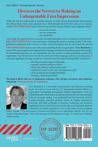 "First Impressions is the ultimate guide to success with people." "Amazing next-level techniques on how to win friends…" Discover the Secrets to Making an Unforgettable First Impression with everyone you meet. Within the first few milliseconds of meeting someone, we make almost instantaneous determinations about them. Most of these value judgments occur subconsciously before the first words are ever spoken, and the first impressions that are formed can and often do last a lifetime. Snap judgments include: • Can you be trusted? • Are you competent? • Are you likable? Surprisingly, the impressions that you make are largely dependent on how you present yourself nonverbally. FIRST IMPRESSIONS is your roadmap to unlocking the secrets to making a positive and unforgettable first impression with everyone you meet. And the best part is that you can control the outcome! FIRST IMPRESSIONS may be one of the most compelling books of a generation. Terry Beckstrom, a former DEA special agent, and recognized body language and behavioral profiling expert offers insightful and practical tips that you can immediately put into practice to make profoundly positive first impressions. You will learn how to break the silent code of body language, and how to use the power of nonverbal signaling to develop exceptional communication and rapport building skills. Learn how to: • Develop immediate rapport with people • Instantly read the emotions of others • Build your influence and persuasion skills • Significantly improve your sales and negotiation skills • Form lasting and meaningful friendships • Develop a magnetic personality This book is filled with easy to implement techniques that will give you power and confidence with people. FIRST IMPRESSIONS is a must-read for anyone who: • Wants to make new friends • Wants more confidence with people • Is trying to get a job • Is searching for Mr. or Mrs. Right • Is a parent or grandparent • Is graduating from high school or college • Is an aspiring leader • Is a business owner, manager or in any leadership position • Works in retail, hospitality or sales • Wants to be more persuasive • Is a teacher or coach • Is a first responder • Is an attorney • Works in ministry • Is in the medical profession • Deals with people either socially or in business Welcome to your new superpower!