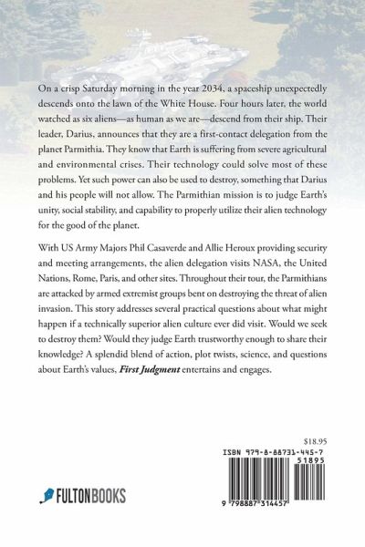 On a crisp Saturday morning in the year 2034, a spaceship unexpectedly descends onto the lawn of the White House. Four hours later, the world watched as six aliens--as human as we are--descend from their ship. Their leader, Darius, announces that they are a first-contact delegation from the planet Parmithia. They know that Earth is suffering from severe agricultural and environmental crises. Their technology could solve most of these problems. Yet such power can also be used to destroy, something that Darius and his people will not allow. The Parmithian mission is to judge Earth's unity, social stability, and capability to properly utilize their alien technology for the good of the planet. With US Army Majors Phil Casaverde and Allie Heroux providing security and meeting arrangements, the alien delegation visits NASA, the United Nations, Rome, Paris, and other sites. Throughout their tour, the Parmithians are attacked by armed extremist groups bent on destroying the threat of alien invasion. This story addresses several practical questions about what might happen if a technically superior alien culture ever did visit. Would we seek to destroy them? Would they judge Earth trustworthy enough to share their knowledge? A splendid blend of action, plot twists, science, and questions about Earth's values, First Judgment entertains and engages.