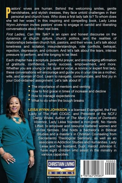 Pastors' wives are human. Let's face it. Behind the welcoming smiles, gentle handshakes, and stylish dresses, they face untold challenges in their personal and church lives. Who does a first lady talk to? To whom does she tell her woes? In this inspiring and compelling book, First Lady Leisa Wynn-Johnson invites pastors' wives to engage in candid and liberating conversations about their real lives. First Ladies, Can We Talk? is an open and honest discourse on the dynamics of church culture, church politics, and the realities of relationships between church folk, pastors, and their wives. Let's talk about loneliness and isolation, misunderstandings, role conflicts, betrayal, rejection, depression, and criticism. And let's talk about the tears, intense pressure to perform, and the longing to be liked. Each chapter has a scripture, a powerful prayer, and an encouraging affirmation of gratitude, confidence, family success, empowerment, and more. Whether you are young or old, quiet or vocal, a novice or expert first lady, a clergy wife, or in ministry yourself, these conversations will uplift, encourage, and guide you in your role as a mother, wife, and woman of God. Learn to navigate, communicate, and find joy in your God-ordained assignment. Let's talk about it!