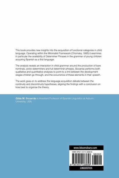 This book provides new insights into the acquisition of functional categories in child language. Operating within the Minimalist Framework (Chomsky 1995) it examines in particular the availability of Determiner Phrases in the grammar of young children acquiring Spanish as a first language. The analysis reveals an interaction in child grammar around the production of bare nominals, proto-determiners and full determiner phrases. Socarrás performs both qualitative and quantitative analyses to point to a link between the development stages children go through, and the occurrence of these elements in their speech. The work goes on to address the language acquisition debate between the continuity and discontinuity hypotheses, aligning the findings with a conclusion on how best to organise the theory.