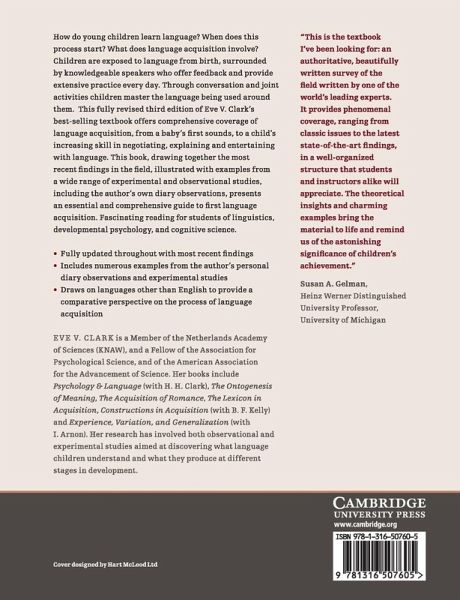 How do children learn to talk? They are exposed to language from birth, interacting with knowledgeable speakers who correct errors and offer extensive practice. Clark provides a comprehensive exploration of first language acquisition, from a baby's first sounds to a child's growing ability to negotiate, explain and entertain using language.