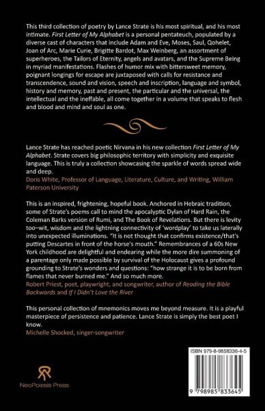 This third collection of poetry by Lance Strate is his most spiritual, and his most intimate. First Letter of My Alphabet is a personal pentateuch, populated by a diverse cast of characters that include Adam and Eve, Moses, Saul, Qohelet, Joan of Arc, Marie Curie, Brigitte Bardot, Max Weinberg, an assortment of superheroes, the Tailors of Eternity, angels and avatars, and the Supreme Being in myriad manifestations. Flashes of humor mix with bittersweet memory, poignant longings for escape are juxtaposed with calls for resistance and transcendence, sound and vision, speech and inscription, language and symbol, history and memory, past and present, the particular and the universal, the intellectual and the ineffable, all come together in a volume that speaks to flesh and blood and mind and soul as one.