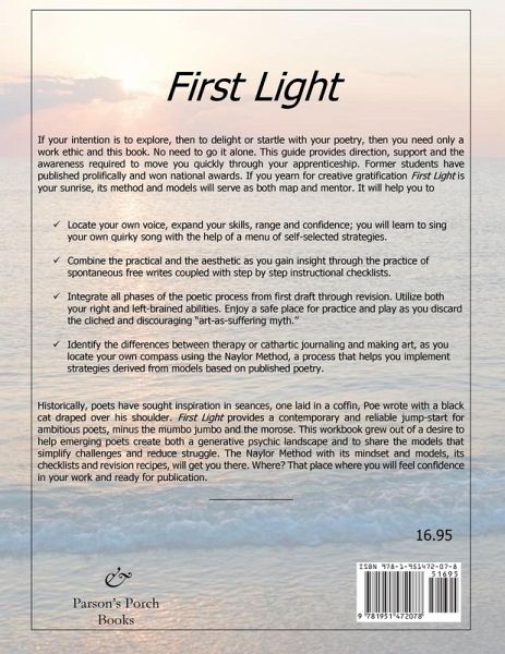 If your intention is to explore, then to delight or startle with your poetry, then you need only a work ethic and this book. No need to go it alone. This guide provides direction, support and the awareness required to move you quickly through your apprenticeship. Former students have published prolifically and won national awards. If you yearn for creative gratification First Light is your sunrise, its method and models will serve as both map and mentor. It will help you to Locate your own voice, expand your skills, range and confidence; you will learn to sing your own quirky song with the help of a menu of self-selected strategies. Combine the practical and the aesthetic as you gain insight through the practice of spontaneous free writes coupled with step by step instructional checklists. Integrate all phases of the poetic process from first draft through revision. Utilize both your right and left-brained abilities. Enjoy a safe place for practice and play as you discard the cliched and discouraging "art-as-suffering myth." Identify the differences between therapy or cathartic journaling and making art, as you locate your own compass using the Naylor Method, a process that helps you implement strategies derived from models based on published poetry.. Historically, poets have sought inspiration in seances, one laid in a coffin, Poe wrote with a black cat draped over his shoulder. First Light provides a contemporary and reliable jump-start for ambitious poets, minus the mumbo jumbo and the morose. This workbook grew out of a desire to help emerging poets create both a generative psychic landscape and to share the models that simplify challenges and reduce struggle. The Naylor Method with its mindset and models, its checklists and revision recipes, will get you there. Where? That place where you will feel confidence in your work and ready for publication.