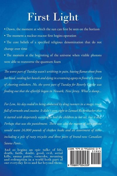 The worst part of Tuesday wasn't writhing in pain, having flames shoot from her head, voiding her bowels and dying in screaming agony in front of a crowd of cheering onlookers. No, the worst part of Tuesday for Beverly Castler was finding out that the afterlife began in Newark, New Jersey. What a dump... For Lem, his day ended in being abducted by drug runners in a magic truck full of corncobs and cocaine. It didn't seem right to Lemuel Rickenbacker that it started with desperately wanting to boil the children in hot oil, but it did. Perhaps that was the punishment. There was also the matter of why anyone would want 24,000 pounds of chicken beaks and an assortment of items including a pile of rusty tricycles and three pairs of brand-new Canadian Sauna Pants...