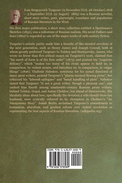 Ivan Sergeyevich Turgenev (9 November [O.S. 28 October] 1818 - 3 September [O.S. 22 August] 1883) was a Russian novelist, short story writer, poet, playwright, translator and popularizer of Russian literature in the West. His first major publication, a short story collection entitled A Sportsman's Sketches (1852), was a milestone of Russian realism. His novel Fathers and Sons (1862) is regarded as one of the major works of 19th-century fiction. Turgenev's artistic purity made him a favorite of like-minded novelists of the next generation, such as Henry James and Joseph Conrad, both of whom greatly preferred Turgenev to Tolstoy and Dostoyevsky. James, who wrote no fewer than five critical essays on Turgenev's work, claimed that "his merit of form is of the first order" (1873) and praised his "exquisite delicacy", which "makes too many of his rivals appear to hold us, in comparison, by violent means, and introduce us, in comparison, to vulgar things" (1896). Vladimir Nabokov, notorious for his casual dismissal of many great writers, praised Turgenev's "plastic musical flowing prose", but criticized his "labored epilogues" and "banal handling of plots". Nabokov stated that Turgenev "is not a great writer, though a pleasant one", and ranked him fourth among nineteenth-century Russian prose writers, behind Tolstoy, Gogol, and Anton Chekhov, but ahead of Dostoyevsky. His idealistic ideas about love, specifically the devotion a wife should show her husband, were cynically referred to by characters in Chekhov's "An Anonymous Story". Isaiah Berlin acclaimed Turgenev's commitment to humanism, pluralism, and gradual reform over violent revolution as representing the best aspects of Russian liberalism. (wikipedia.org)