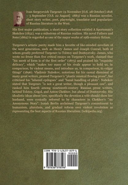Ivan Sergeyevich Turgenev (9 November [O.S. 28 October] 1818 - 3 September [O.S. 22 August] 1883) was a Russian novelist, short story writer, poet, playwright, translator and popularizer of Russian literature in the West. His first major publication, a short story collection entitled A Sportsman's Sketches (1852), was a milestone of Russian realism. His novel Fathers and Sons (1862) is regarded as one of the major works of 19th-century fiction. Turgenev's artistic purity made him a favorite of like-minded novelists of the next generation, such as Henry James and Joseph Conrad, both of whom greatly preferred Turgenev to Tolstoy and Dostoyevsky. James, who wrote no fewer than five critical essays on Turgenev's work, claimed that "his merit of form is of the first order" (1873) and praised his "exquisite delicacy", which "makes too many of his rivals appear to hold us, in comparison, by violent means, and introduce us, in comparison, to vulgar things" (1896). Vladimir Nabokov, notorious for his casual dismissal of many great writers, praised Turgenev's "plastic musical flowing prose", but criticized his "labored epilogues" and "banal handling of plots". Nabokov stated that Turgenev "is not a great writer, though a pleasant one", and ranked him fourth among nineteenth-century Russian prose writers, behind Tolstoy, Gogol, and Anton Chekhov, but ahead of Dostoyevsky. His idealistic ideas about love, specifically the devotion a wife should show her husband, were cynically referred to by characters in Chekhov's "An Anonymous Story". Isaiah Berlin acclaimed Turgenev's commitment to humanism, pluralism, and gradual reform over violent revolution as representing the best aspects of Russian liberalism. (wikipedia.org)